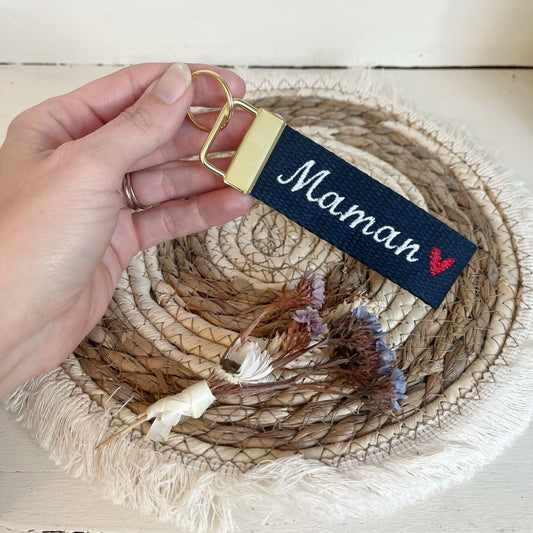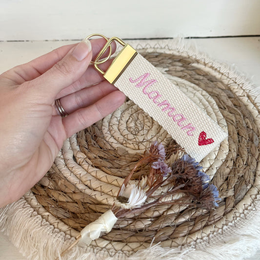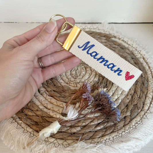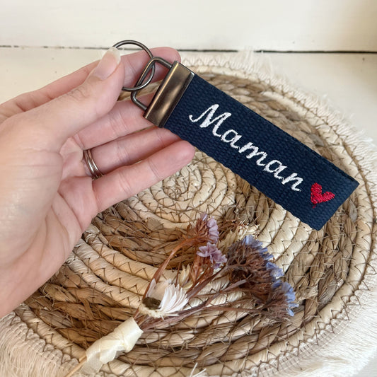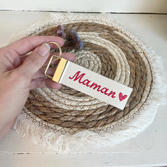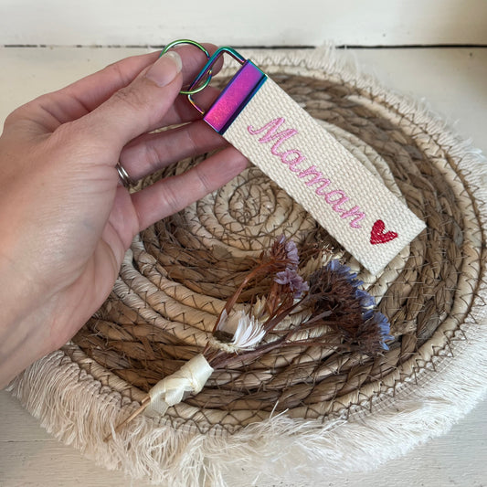Porte clé brodé « Maman » cœur