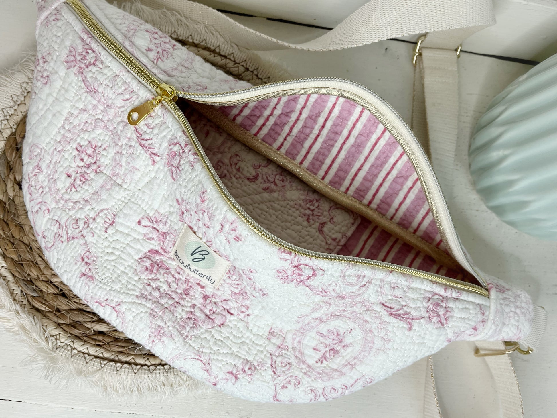 Sac Banane “Up-cyclé” toile de Jouy rose et blanc